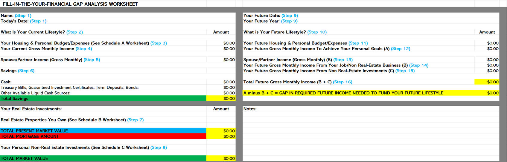 I never knew how much income I needed to buy real estate when I started. As a result, I had to scrape by to generate more savings to buy my first real estate deal — because no one warned me what to watch for until I learned this creative tip from wealthy real estate investors. Whether you are a 9-5 high-income worker tired of financial uncertainty with no clear direction on where your money you have built should go. Or an entrepreneur struggling to produce more cash flow than expenses, here is a solution to help you out. The Wealth Gap Worksheet gives you a simple money snapshot of your income, expenses, debt, and savings. It gives you a warning sign about where the state of your finances are, and what you need to adjust to bridge your wealth gap to achieve your life goals. It gives you real estate investing roadmaps to create active and passive income (even when you’re busy or low on cash). It offers you and your partner/spouse or business partner to have real, honest conversations about money and the future to get on the same page—no money fights, just shared goals.